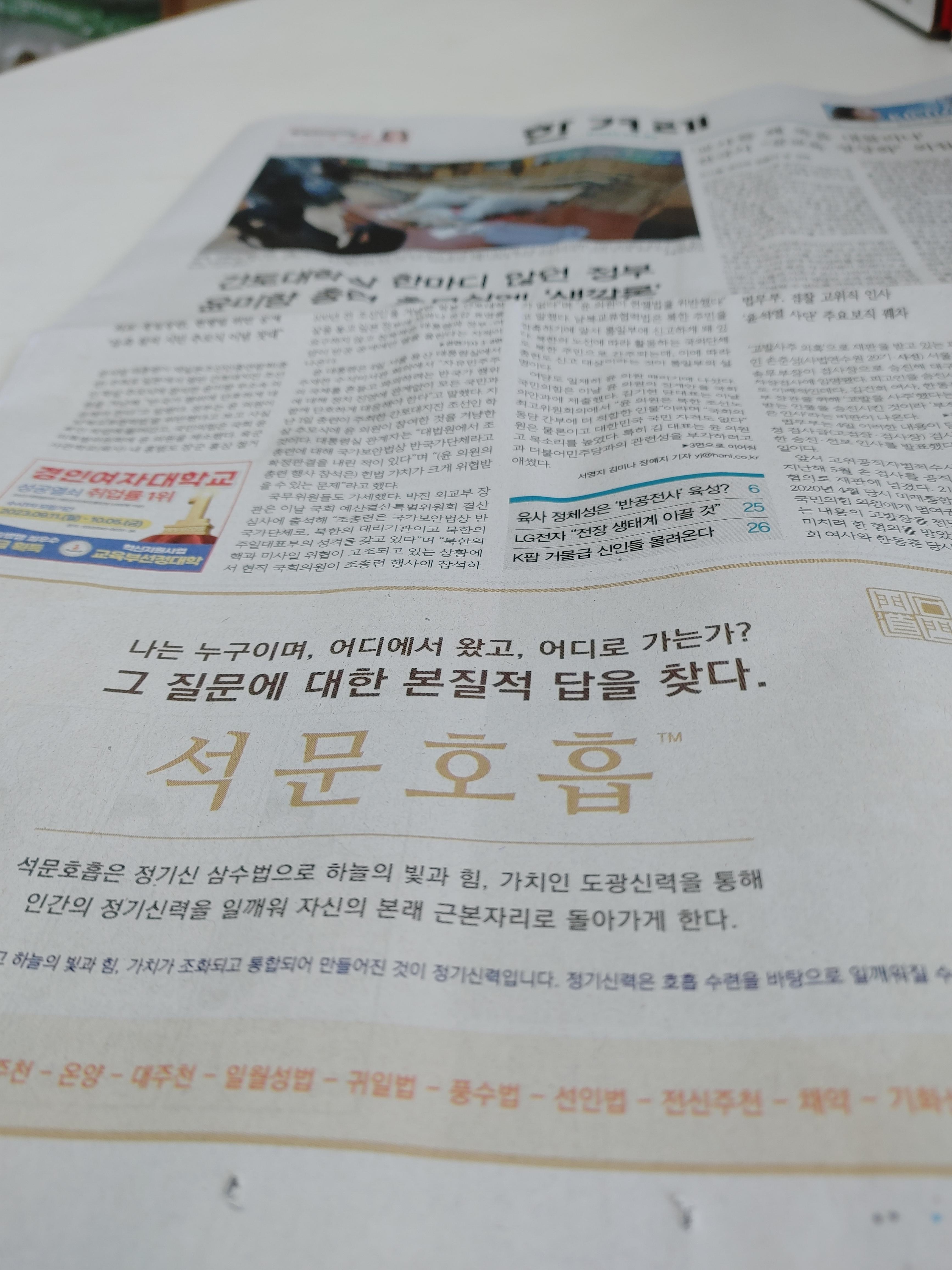 한기 35년 7월 21일 (태양력 2023년 9월 5일, 火) 한겨레 1면에 게재한 석문호흡 광고