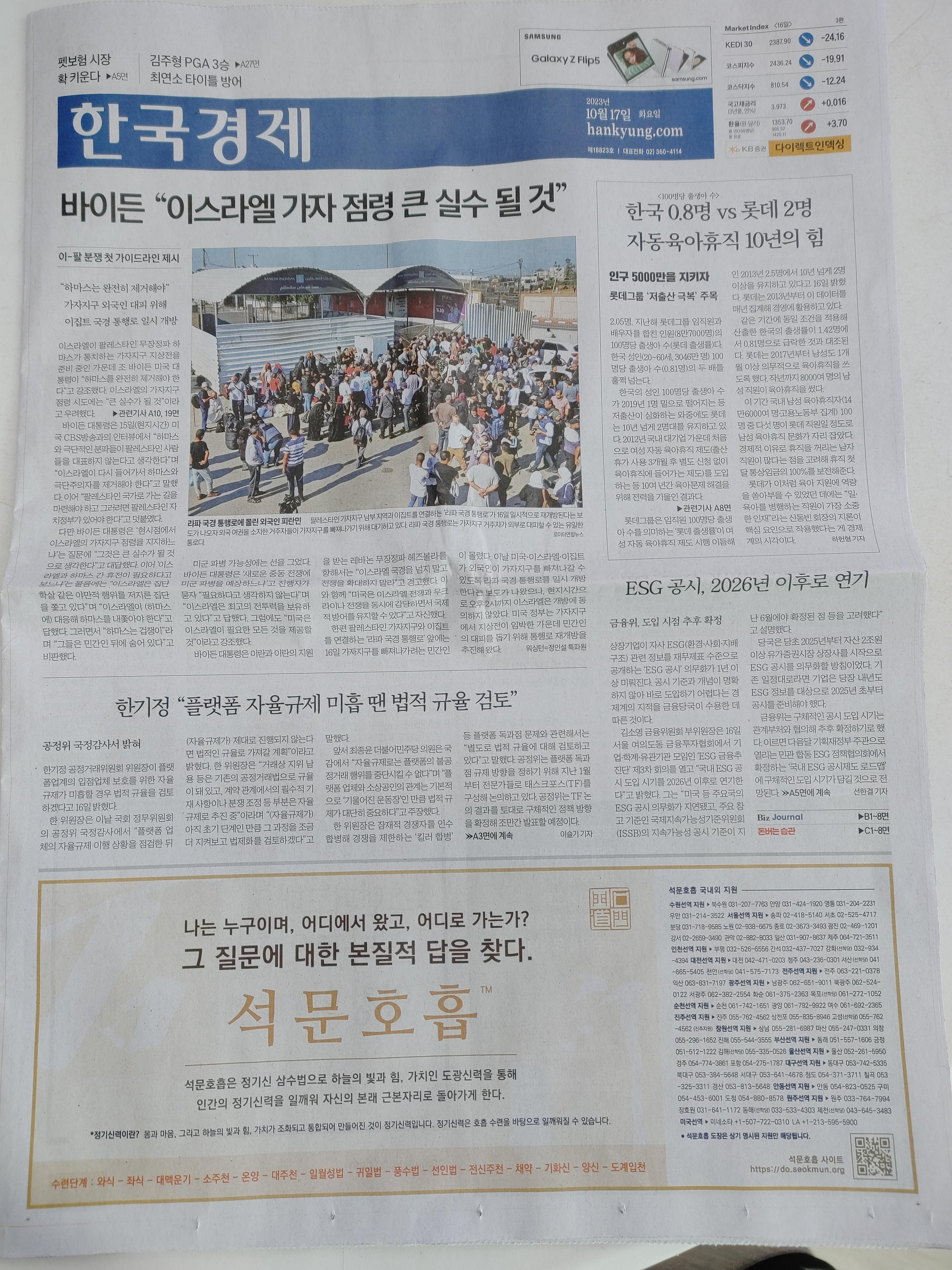 한기 35년 8월 27일(태양력 2023년 10월 17일, 火) 한국경제 1면에 게재한 석문호흡 광고