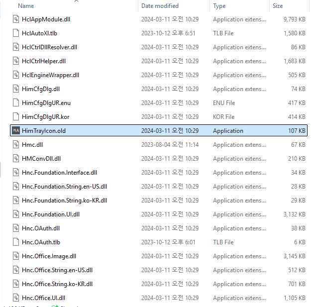 위 파일명을 HimTrayIcon.old 로 변경하니 거짓말처럼 아무 문제 없이 한글2024가 실행 됩니다.